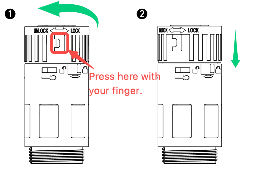 To disassemble the AC connector, depress the buckle and turn the body to the unlocking icon.