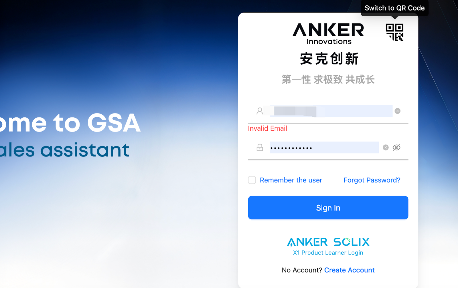 Please create an account in the Anker App first: https://support.ankersolix.com/s/article/How-to-Register-as-an-Anker-SOLIX-Installation-Partner , then use the same account and password to log in to the GSA Platform.