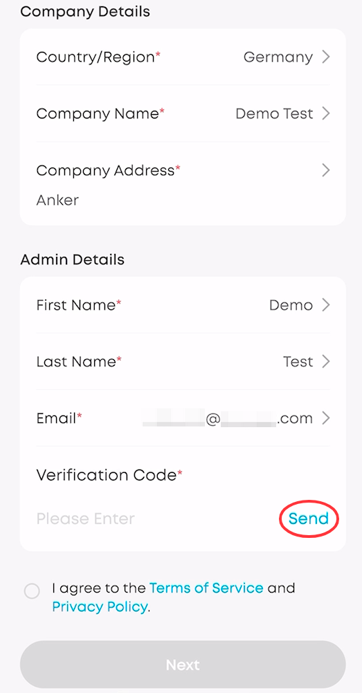 For Installer: Fill in your company details and your personal information to register your email as the admin account. After ensuring the email address is correct, tap Send. You will receive a verification code.