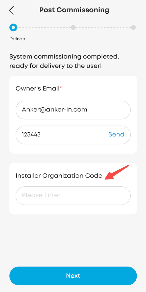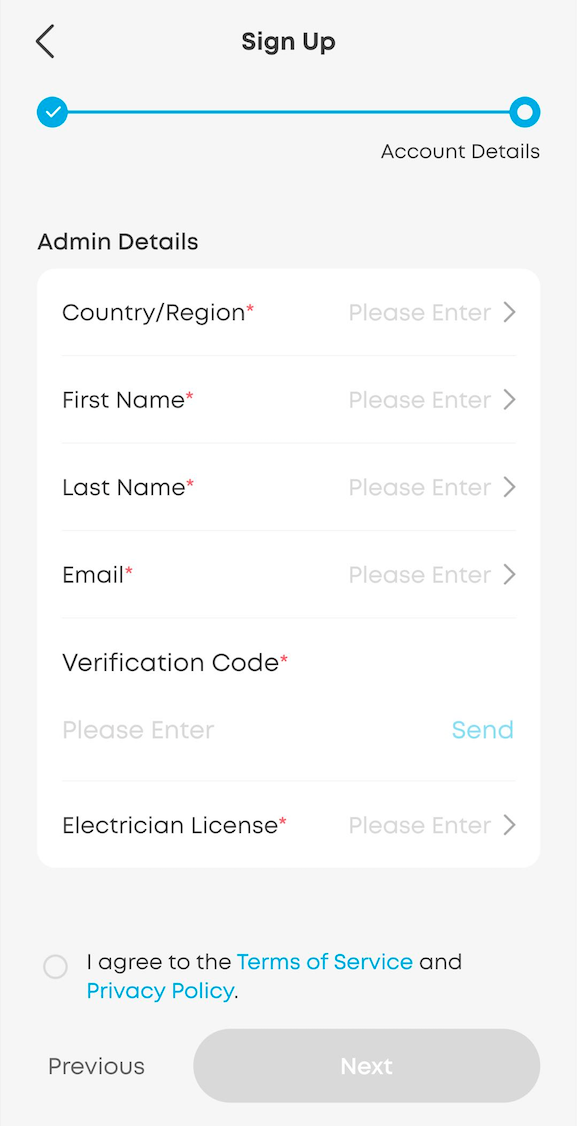 For Electrician: Fill in your own personal information to register your email as the admin account. After ensuring the email address is correct, tap Send. You will receive a verification code.