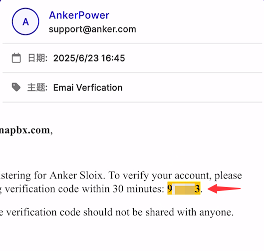 Go to the inbox of the email you just input and find an email from AnkerPower. It contains a 6-digit verification code. Remember the code.