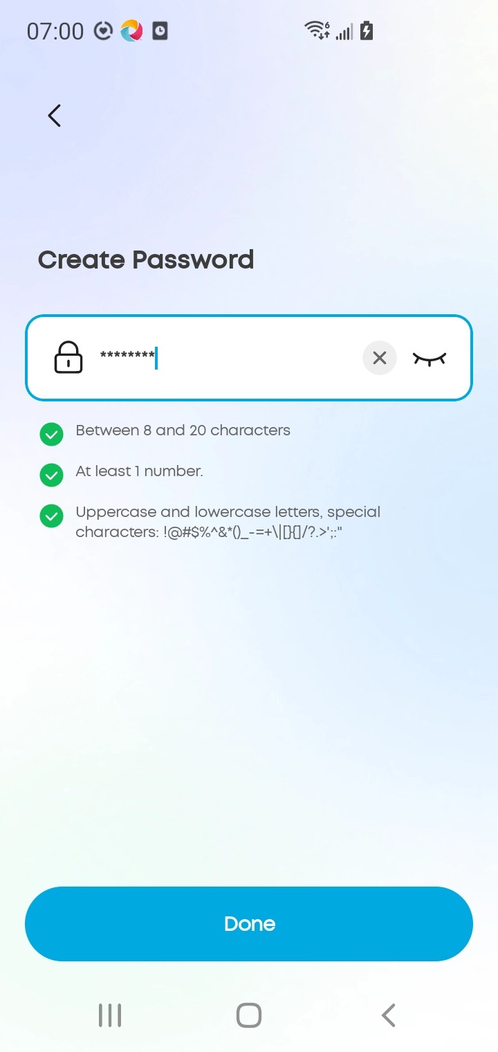 Enter your password,then click "Done". Please note the password requirements listed below the password input field.